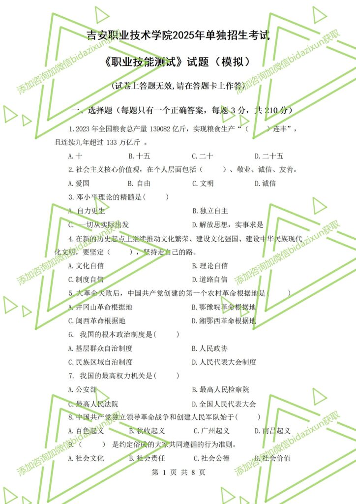 吉安职业技术学院2025年单独招生考试《职业技能测试》模拟试卷 3周前 历年真题 102 添加 bidazixun,微信领取,专人服务 本套试题为吉安职业技术学院2025年单独招生《职业技能测试》模拟卷,由专业教师团队依据官方考纲组织命题。 本试题为模拟练习资料,非官方真题,预祝各位考生成功! 阅读全文 0 0 吉安职业技术学院