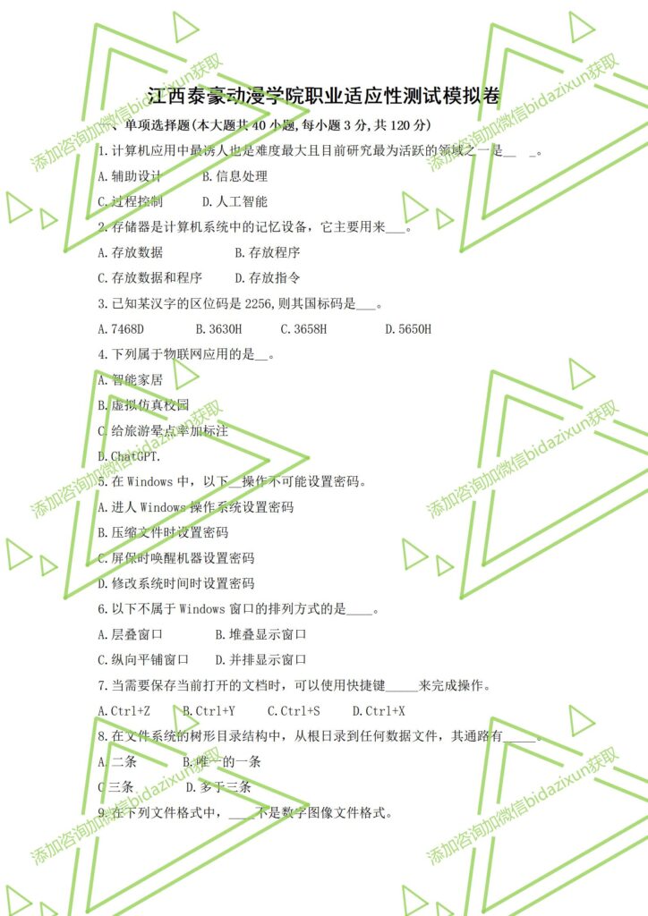 江西泰豪动漫职业学院职业适应性测试模拟卷 3周前 历年真题 138 添加 bidazixun,微信领取,专人服务 本套试题为江西泰豪动漫学院单独招生《职业技能测试》模拟卷,由专业教师团队依据官方考纲组织命题。 本试题为模拟练习资料,非官方真题,预祝各位考生成功! 阅读全文 0 0